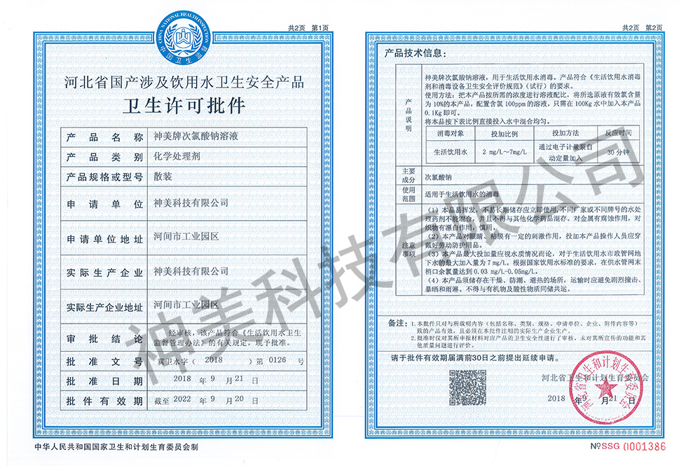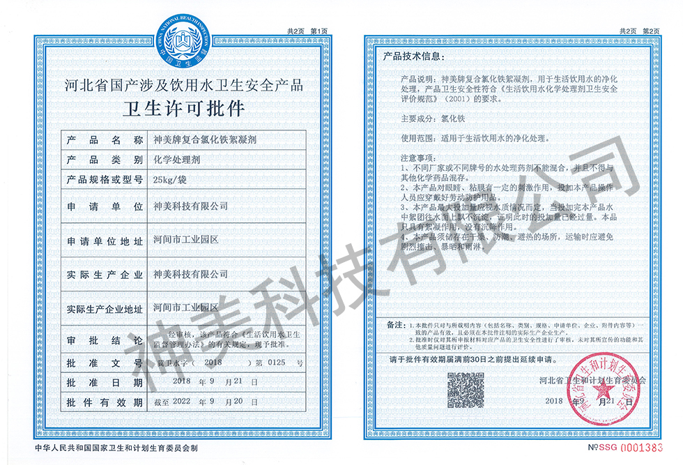 近日,神美科技旗下三款化學(xué)處理劑經(jīng)過(guò)河北省衛(wèi)生和計(jì)劃生育委員會(huì)等主管部門的嚴(yán)格審核、檢測(cè),已順利通過(guò)全部審批流程,取得《河北省國(guó)產(chǎn)涉及飲用水衛(wèi)生安全產(chǎn)品衛(wèi)生許可批件》。![]()