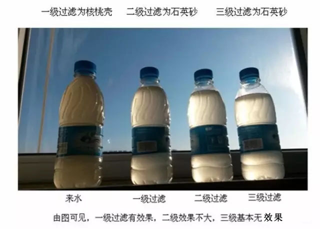 2現(xiàn)存主要問題 1 現(xiàn)有回注水處理工藝大多為:核桃殼+石英砂或核桃殼+一級石英砂+二級石英砂過濾工藝,隨著采油技術(shù)的發(fā)展,例如化學(xué)驅(qū)油,三元共驅(qū)工藝的實施,水中聚合物含量升高,現(xiàn)有的設(shè)備逐漸難以滿足回注水要求。 2 核桃殼和石英砂過濾罐頂部一般設(shè)有攪拌器,目的在于對因油而兒粘連的濾料進行分離,但實際效果并不理想,對懸浮物和油的截留效果均有待提升。 3 正因為上述問題,現(xiàn)有處理設(shè)備已經(jīng)越來越難以滿足設(shè)計要求,并不是設(shè)備不好,而是進水的水質(zhì)變差了,而出水要求仍然不變或更高了。只有更新?lián)Q代才能滿足更高的技術(shù)要求。 4 由于產(chǎn)油中水的比例越來越高,有的已經(jīng)高達90%,因此原來設(shè)計的老設(shè)備不但技術(shù)要求達不到,產(chǎn)量也難以滿足逐漸增多的水量要求。 5 下圖是某油田回注水現(xiàn)場過濾效果取樣,三級過濾工藝,進入第一級過濾之前加絮凝劑,第一級為核桃殼,第二級為石英砂,由于出水效果不符合要求,又增加了第三級石英砂過濾,但是效果不明顯。分析原因既包括絮凝問題也包括過濾精度問題。