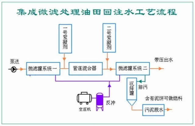 3微濾技術(shù)路線 集成微濾技術(shù)包括了:微絮凝+微濾 采用微濾罐適用于物理性水處理,主要功能是去除水中的懸浮物和膠體,對于溶解性物質(zhì),例如溶解性含聚水,則單純依靠物理手段還不夠,集成微濾系統(tǒng)指的是:在微濾前面設(shè)置絮凝程序,在水中添加適當?shù)姆葱跄齽┗蚱迫閯渲邪ㄓ袡C,無機,生物和礦物質(zhì)絮凝劑,針對不同的水質(zhì)進行復(fù)配,將溶解性物質(zhì)轉(zhuǎn)變?yōu)榉侨芙庑詰腋∥铮M而通過高精度的微濾罐濾除,而微絮凝則是省略了傳統(tǒng)該工藝中的攪拌池和沉淀池工藝,在管道中加藥直接進入微濾罐。這是針對油田回注水的實際情況而研發(fā)的專用設(shè)備系統(tǒng)。