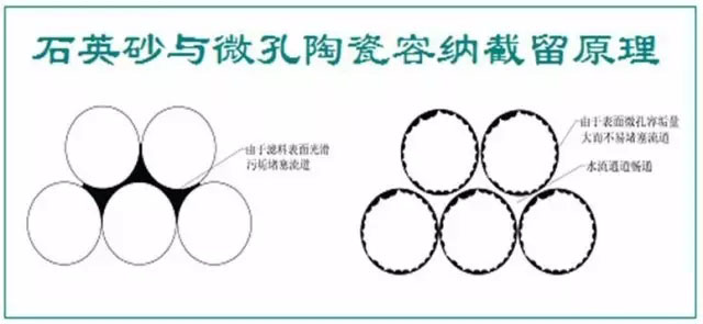 石英砂(或海砂)表面光滑且基本沒有空隙,因而截留懸浮物基本靠的是顆粒之間的縫隙,截流的雜質(zhì)很快堵塞流道,繼續(xù)過濾則形成污泥層,水流穿過逐漸加厚的污泥層會引起水頭升高或過濾壓力升高,對于實際過濾設(shè)備或過濾池的表現(xiàn)就是,反沖洗周期縮短,消耗較大的反沖水耗與能耗。 輕質(zhì)微孔陶瓷濾料表面幾乎被可見孔布滿,并且存在許多顯微孔,這些孔徑極易截留雜質(zhì),而雜質(zhì)的滯留并不影響顆粒之間的空隙,因而占用有效流道的時間要比傳統(tǒng)砂濾長很多,也就是反洗周期長。 四 微孔陶瓷過濾截留機理 下圖表示二種不同形式的過濾原理,傳統(tǒng)砂濾實際上是壓力機械阻擋為主,小孔截留大的雜質(zhì),過濾精度取決于表層沙粒的大小,例如,過濾罐實際裝填的濾料最小僅為0.5-1.2mm,而采用新型輕質(zhì)微孔陶瓷節(jié)能型微濾的機理是:除了機械阻擋以外,還兼有化學(xué)物理吸附,以渣濾渣等復(fù)合截留作用。用其制造的過濾設(shè)備有如下特點: ● 同比條件下,濾料直徑可以放大1~2個級別,例0.5mm的石英砂可以改為1~3mm的微孔陶瓷,這意味著提高了容垢量或延長了反沖洗周期。 ● 同比條件下降低了過濾壓降,而降低壓降就是節(jié)能,當用于壓力過濾罐時,大部分過濾周期中,進出水表觀壓降幾乎為零,實際壓降0.01Mpa~0.05Mpa。 ●由于比重輕(1.1g/cm3),容重也輕(0.6~0.7g/cm3),因而大大降低了反沖洗能耗,對采用大流量的微濾系統(tǒng)而言,無需專用的反洗水箱及大流量水泵,可不受傳統(tǒng)的水力沖洗原理約束,無需罐頂中心的攪拌器,同比節(jié)約80%的反沖洗用水和80%的反洗能耗。