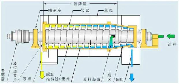 轉鼓直徑和有效長度 轉鼓直徑越大,有效長度越長,其有效沉降面積越大,處理能力也越大,物料在轉鼓內的停留時間也越長,在相同的轉速下,其分離因數就越大,分離效果越好。